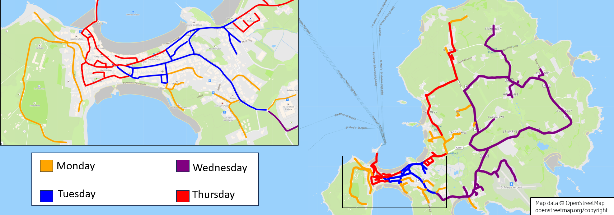 You can view a map of St Mary's and the waste collection rounds as of 26 May 2025 below, along with a table listing the areas of St Mary's and their waste and recycling collection days. If you require any of this information in a different format, please contact zerowaste@scilly.gov.uk or call 01720 424450.