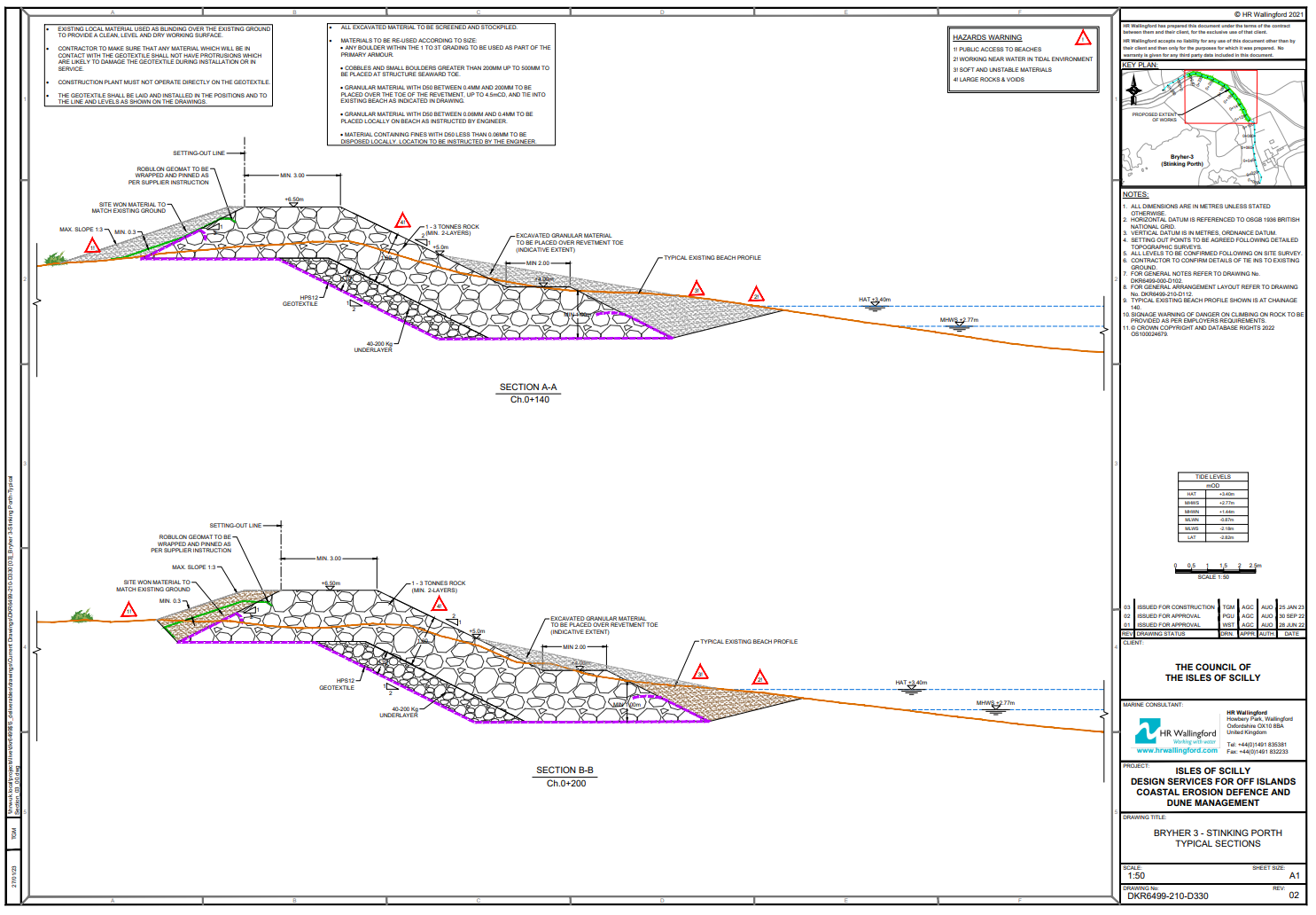 The sea defences will be formalised here by using rock armour to protect against wave overtopping. The width of the crest will be extended from its existing position to a minimum of 3 m and then slope down towards the beach. Site-won material will be used to tie in the rear of the rock armour to the existing ground.