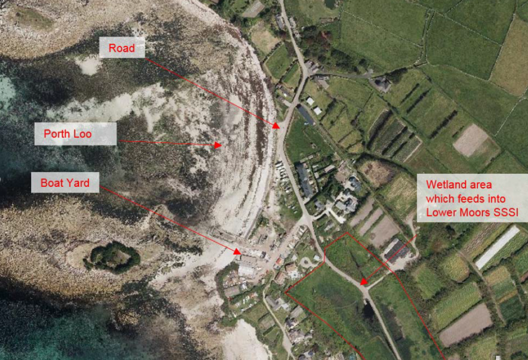 At the southern end of the beach there is a sand dune that provides protection from flooding. The northern extent of the beach is defended by ad hoc placed rocks of various sizes, backed by an embankment next to the road. This section has been susceptible to erosion and waves breaking over and flooding the road when there are storms. There is also a significant risk to the Lower Moors SSSI, as the wetland area to the south east of Porthloo is vulnerable to flooding. The sea water will feed into the Lower Moors from here and this can harm local wildlife.