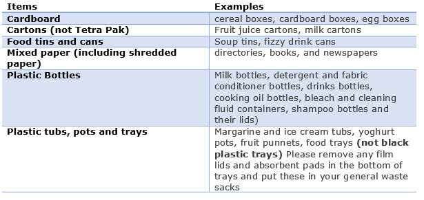 Mixed recycling - please make sure everything is clean and dry before placing in the recycling sacks. Please ensure that all recyclable material is placed inside the sack and tied at the top. Any over-sized 'side' items will not be collected. Any sacks which do not meet requirements will not be collected. Below is a list of items that can be recycled.