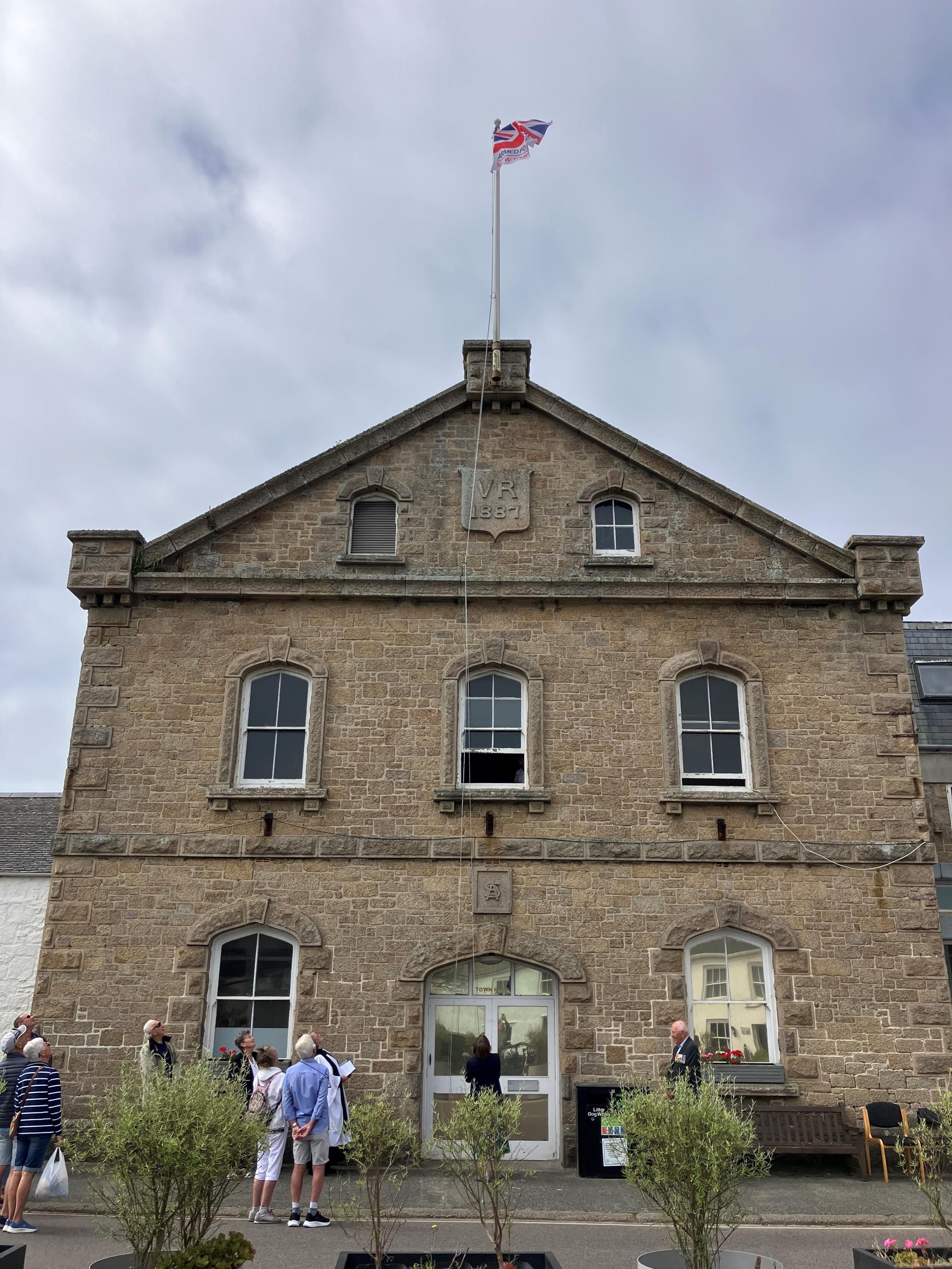 Image 1: Armed Forces Day flag being raised on the Town Hall, St Mary's by Cllr Grottick, Vice Chairman of Council