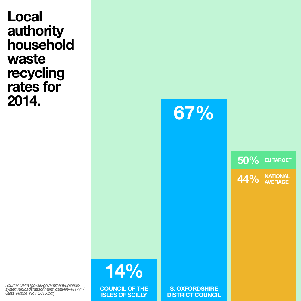 On 1 December 2015 Defra released the statistics on waste managed by local authorities for 2014. Regrettably, the Council of the Isles of Scilly recorded the lowest household waste recycling rate in the country. More importantly, our recycling rate of 14% is well below the 50% rate required by the year 2020 as detailed in the EU Waste Directive. It is also far short of the best performing authority, South Oxfordshire District Council, at 67% and the national average of almost 45%. Clearly we must do better.