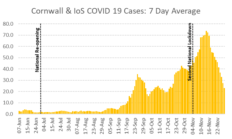 Our Public Health team has made it clear that Tier 1 status does not mean we should relax our efforts to prevent the spread of coronavirus. The graph below shows the effect of lockdown on case numbers in Cornwall and the Isles of Scilly and clearly demonstrates that cases decrease when social contact is limited. You do make a difference when you act with caution and how we all behave between now and the roll out of a vaccine could mean the difference between our region's hospitals and services being able to cope and them being overwhelmed.