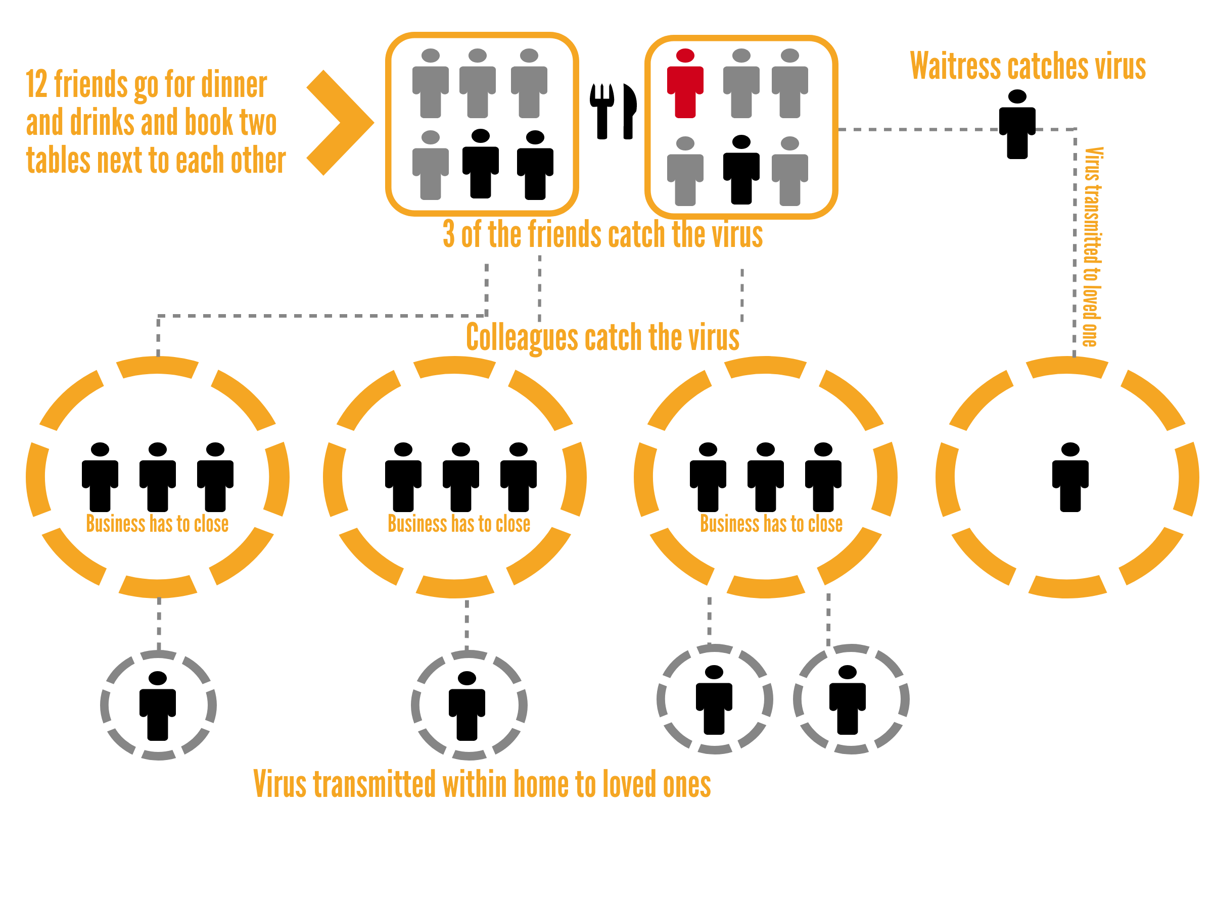 The graphic below illustrates a real example in Cornwall where 12 friends went out to dinner and booked 2 tables of 6 next to each other. One person in the group had coronavirus but didn't realise - they then passed it on to 3 further friends as well as the waitress serving the tables. This resulted in 3 small businesses and offices having to close. These people passed the virus onto their households and ultimately 18 people were infected following this single night out. The rules clearly restrict interaction to a maximum of 6 people, and by stretching these rules in this instance, lots more people were put at risk and contracted the virus.